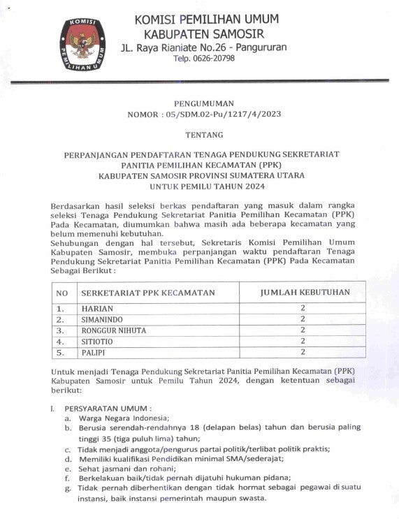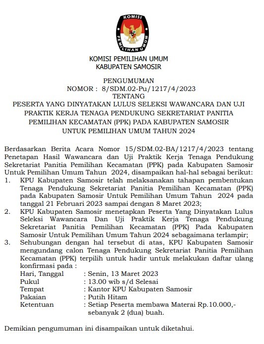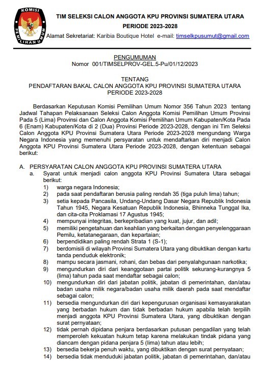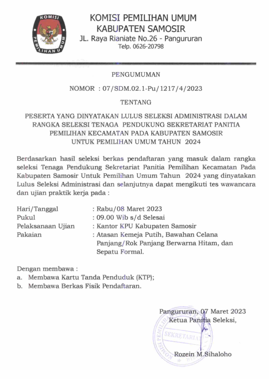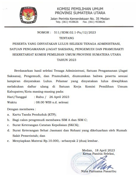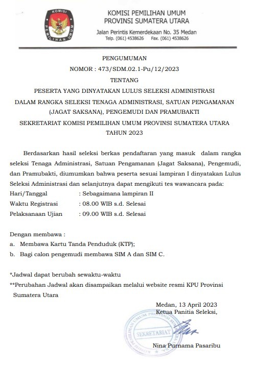 PESERTA YANG DINYATAKAN LULUS SELEKSI ADMINISTRASI DALAM RANGKA SELEKSI TENAGA ADMINISTRASI, SATUAN PENGAMANAN (JAGAT SAKSANA), PENGEMUDI DAN PRAMUBAKTI SEKRETARIAT KOMISI PEMILIHAN UMUM PROVINSI SUMATERA UTARA TAHUN 2023