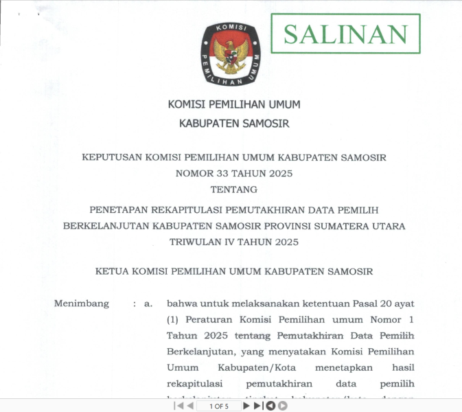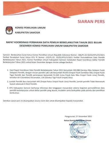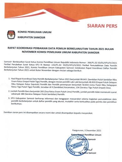 Senin, 27 Desember 2021 KPU Kabupaten Samosir Menyampaikan Siaran Pers terkait Pengumuman Pemutakhiran Data Pemilih Berkelanjutan (PDPB) Periode Desember Tahun 2021 sebagai berikut :