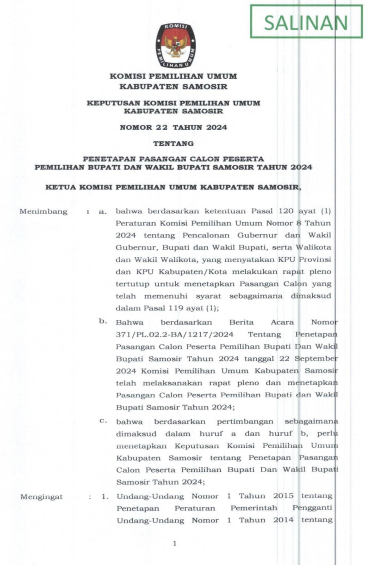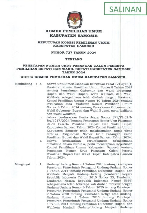 Penetapan Pasangan Calon Peserta Pemilihan Bupati Dan Wakil Bupati Samosir Tahun 2024