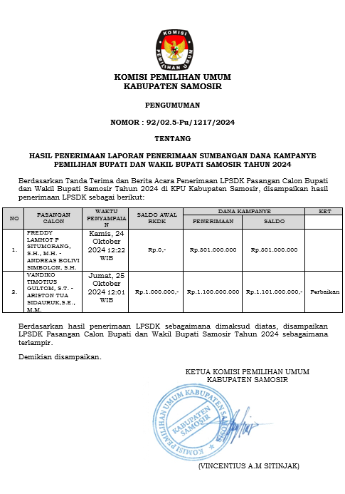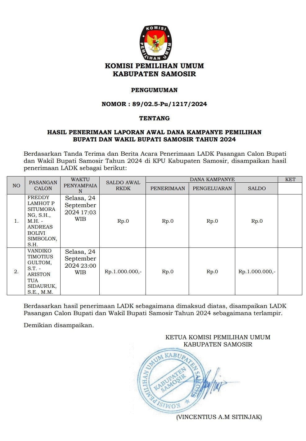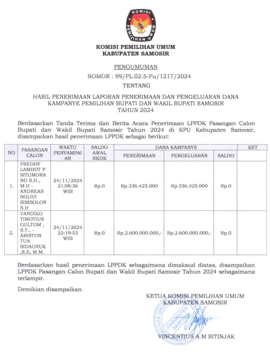 HASIL PENERIMAAN LAPORAN PENERIMAAN SUMBANGAN DANA KAMPANYE PEMILIHAN BUPATI DAN WAKIL BUPATI SAMOSIR TAHUN 2024