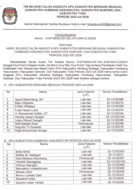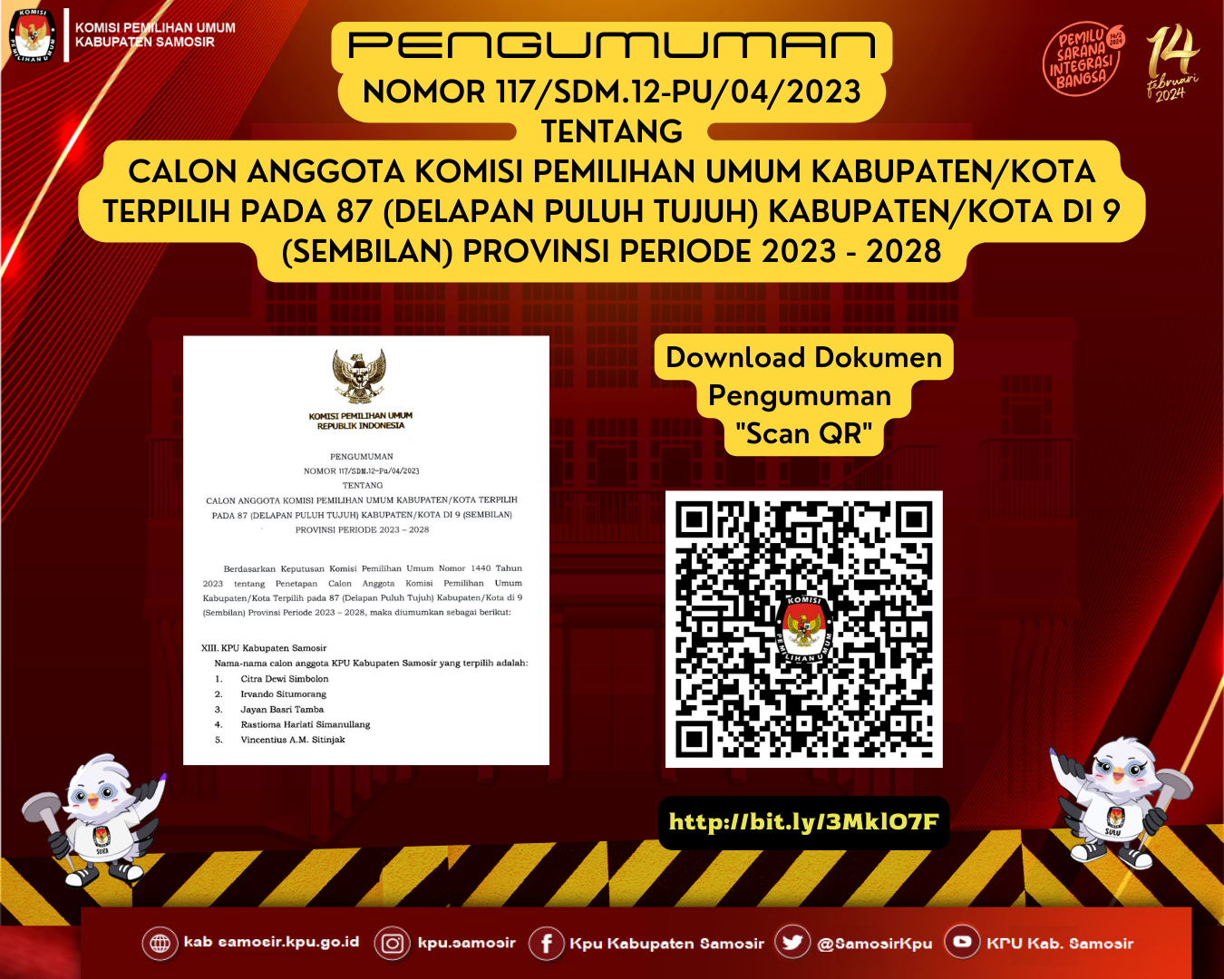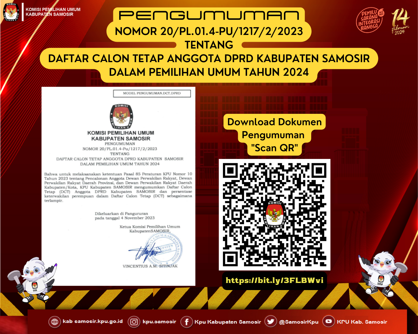 KPU Kabupaten Samosir Menerima masukan dan tanggapan masyarakat terkait dengan pemenuhan persyaratan administrasi Daftar Calon Sementara Anggota DPRD Kabupaten Samosir, masukan dan tanggapan dapat disampaikan secara tertulis disertai dengan bukti identitas diri dan bukti yang relevan kepada KPU Kabupaten SAMOSIR melalui :