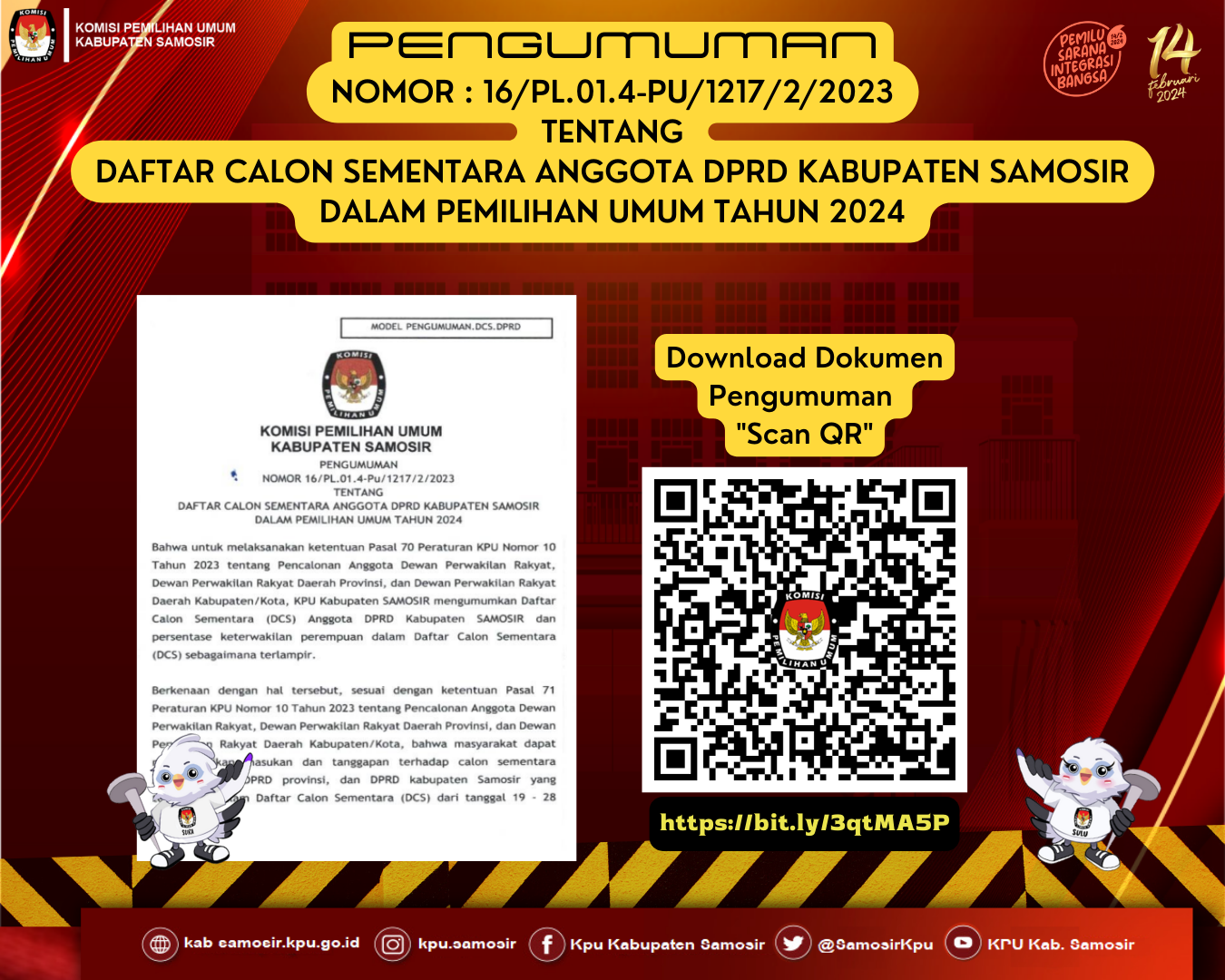 Berikut ini adalah Pengumuman KPU Kabupaten Samosir Nomor 16/Pl.01.4-Pu/1217/2/2023 Tentang Daftar Calon Sementara (DCS) Anggota DPRD Kabupaten Samosir